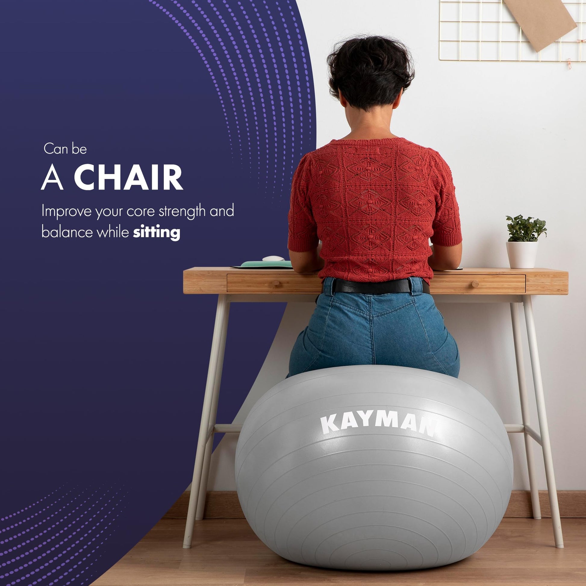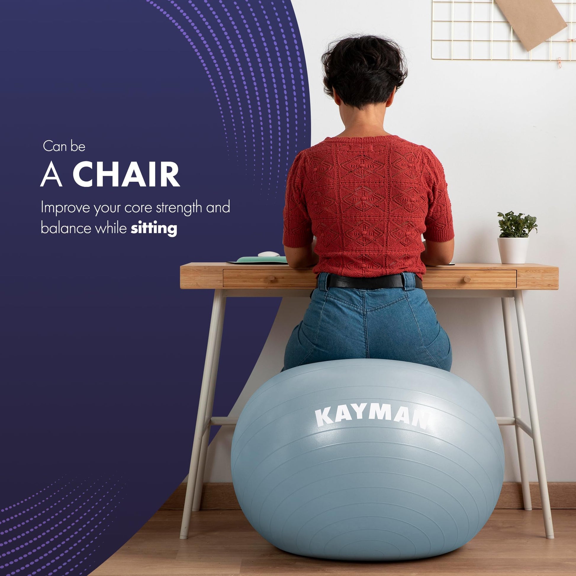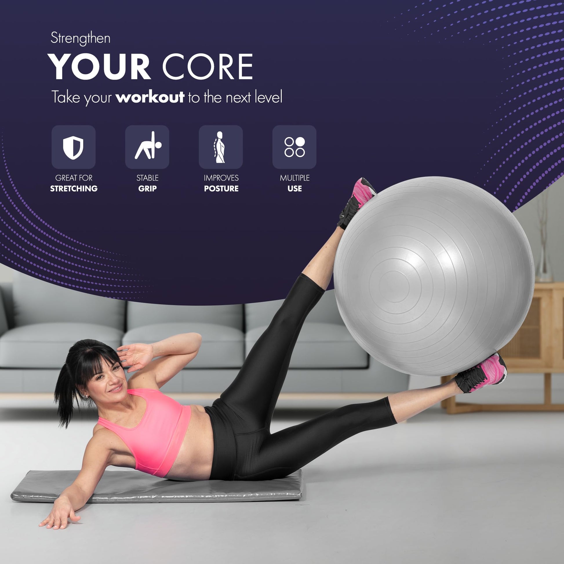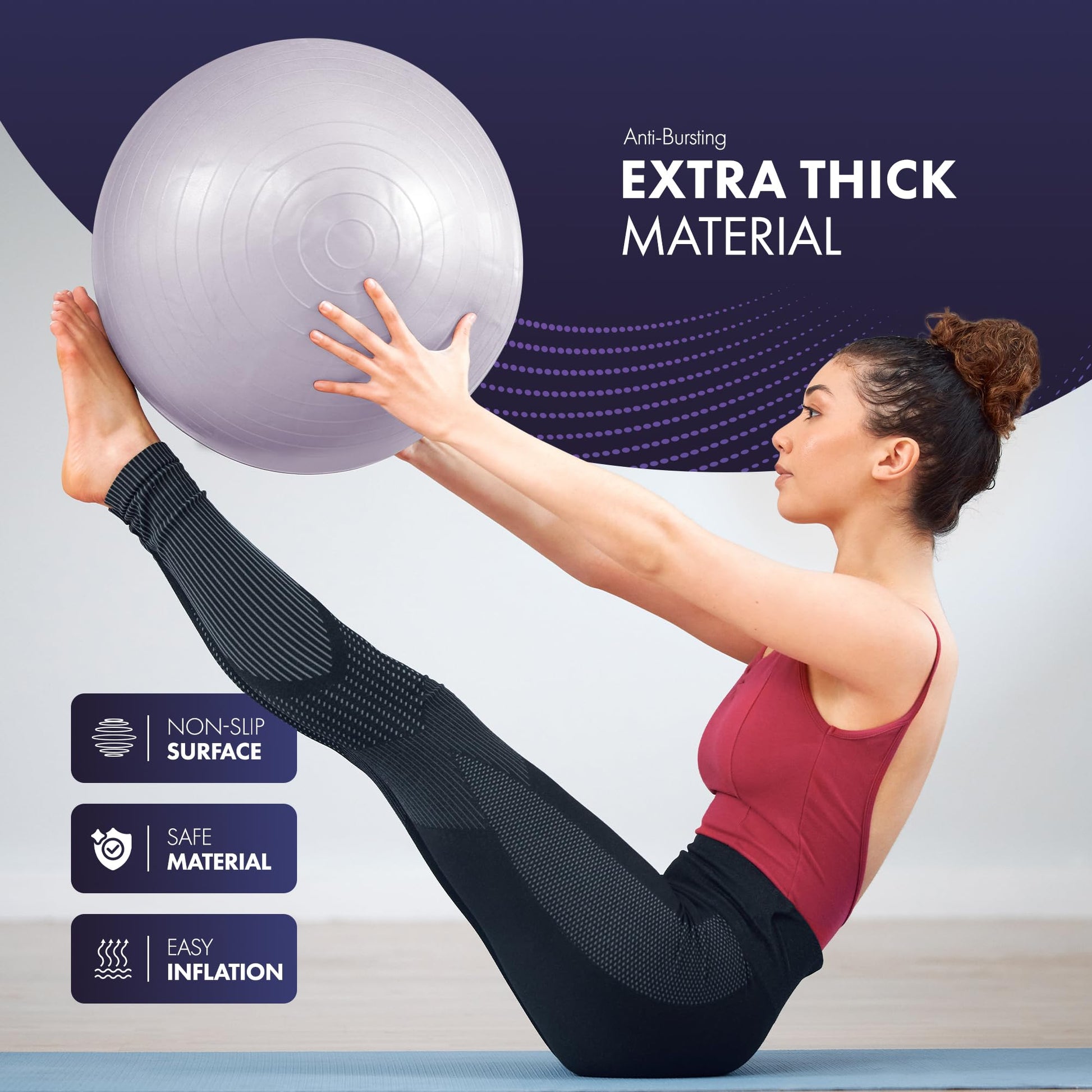 - Advanced Anti-Burst System for Safe Workouts: Stay confident during workouts with this exercise ball's robust anti-burst system, designed to resist punctures and ensure safety. Perfect for yoga, pilates, balance training, core strengthening, and versatile home or gym exercises.